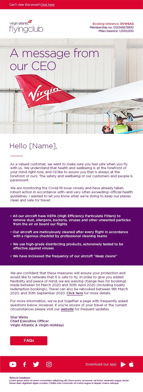 Customer communication was key when the Covid-19 pandemic began. Especially with all the press surrounding Virgin Atlantic, Richard Branson, and the airline industry in general. I worked as part of the crisis team while 80% of the Virgin Atlantic staff were on furlough, leading on creating reassuring and empathetic communications in an extremely tough customer environment. This meant ensuring strong messaging, but making sure it was not repetitive - especially as there was no way of knowing how long the situation would continue.